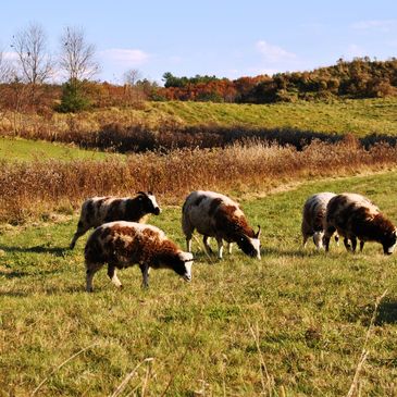 Jacob Sheep are a primitive small to medium sized breed. They are known for their unique appearance which can be attributed to their spotted fleece and multiple sets of horns. They are easy to maintain and highly resistant to parasites.